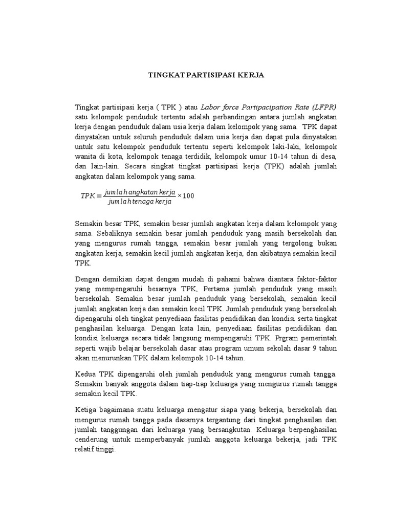 Setengah penganggur setengah penganggur adalah kegiatan seseorang yang bekerja kurang dari 35 jam per minggu 10. Jurnal ilmiah ilmu pendidikan, ilmu ekonomi,. Sedangkan pengertian tingkat partisipasi angkatan kerja (tpak) adalah perbandingan antara jumlah angkatan kerja dengan penduduk usia kerja dalam kelompok yang sama. Menurut mulyadi (2003) tingkat partisipasi angkatan kerja (tpak) adalah situasi yang menggambarkan jumlah angkatan kerja dalam suatu kelempok umum sebagai presentase penduduk dalam kelompok umur tersebut. Tingkatan partisipasi menurut ahli dan pakar akan dibahas dengan lengkap pada materi pelajaran sosiologi sebagai berikut ini. Mengindikasikan besarnya persentase penduduk usia kerja yang aktif secara ekonomi disuatu negara/wilayah. Menurut simanjutak (1985) yang dinamakan angkatan kerja adalah jumlah yang bekerja dan pencari kerja. Tingkat partisipasi angkatan kerja menurut mulyadi (2003), mengenai pengertian tingkat partisipasi angkatan kerja adalah : B = jumlah penduduk 15thn keatas. Jul 26, 2021 · situs referensi muslimah terupdate dilengkapi dengan hijab terbaru, jilbab terbaru, gamis terbaru, mukena terbaru, baju muslim terbaru, model khimar Pengukuran tpak dilakukan dengan cara menghitung jumlah absolut seluruh angkatan kerja dibagi dengan seluruh tenaga kerja atau penduduk usia kerja kemudian dikalikan 100. Tingkat partisipasi angkatan kerja (tpak) tingkat partisipasi angkatan kerja adalah perbandingan antarajumlah angkatan kerja dengan jumlah seluruh penduduk usia kerja. Adapun dalam badan pusat statistik (2016) tingkat partisipasi angkatan kerja (tpak) adalah persentase